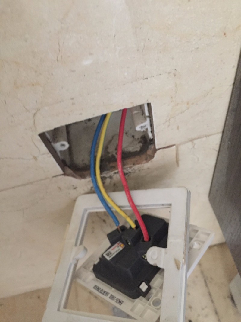 为了一探究竟,师傅先关掉了电源拆下来插座看看里面到底是怎么回事,拆开以后发现里面一直有水从插座的暗盒里面往外流(不是渗) 根据师傅现场的判断应该是工人在安装柜子的时候打膨胀螺丝不小心刚好打在了给水管上,导致的给水管破裂。